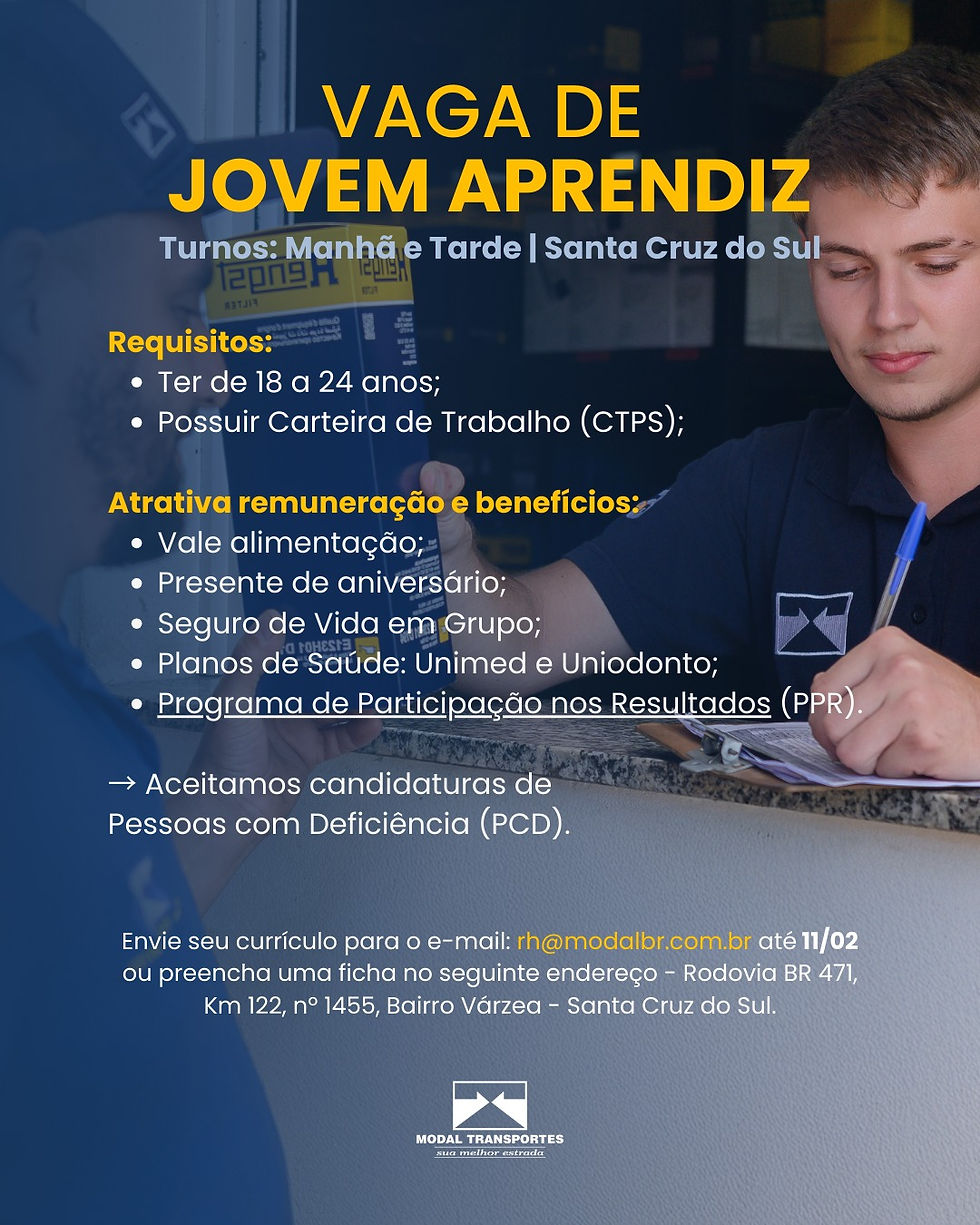 Envie seu currículo para o e-mail: rh@modalbr.com.br até 11/02 ou preencha uma ficha no seguinte endereço - Rodovia BR 471, Km 122, nº 1455, Bairro Várzea - Santa Cruz do Sul.